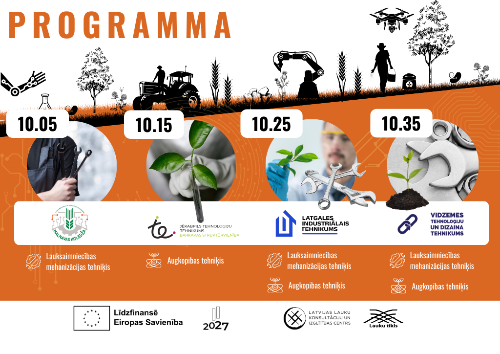 Šogad skolēni varēs gūt plašāku ieskatu četru profesionālo lauksaimniecības skolu piedāvātajās izglītības un sadzīves iespējās. Par augkopības un lauksaimniecības mehanizācijas programmu apguvi informēs Jēkabpils Tehnoloģiju tehnikuma Barkavas struktūrvienības, Latgales Industriālā tehnikuma izglītības programmas īstenošanas vietas “Višķi”, Latvijas Biozinātņu un tehnoloģiju universitātes (LBTU) Malnavas koledžas, kā arī Priekuļos esošie Vidzemes Tehnoloģiju un dizaina tehnikuma audzēkņi un mācībspēki.